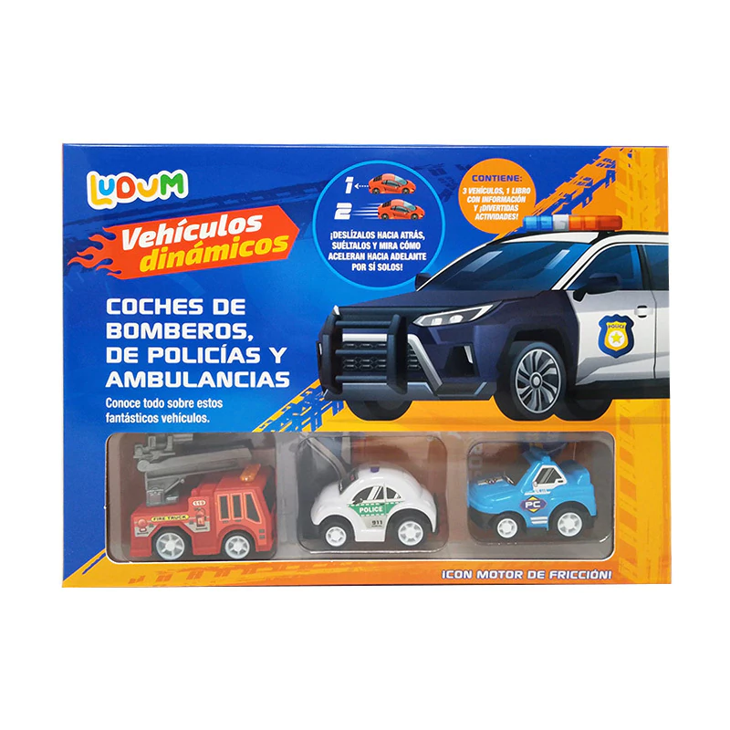 Juega y diviértete con este pack de tres vehículos "dinámicos" y aprende un montón de cosas sobre coches de bomberos, policías y ambulancias gracias al libro que encontrarás en su interior.
