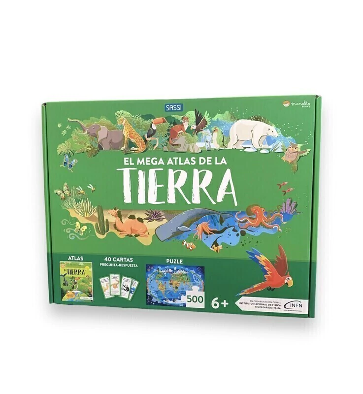 EL MEGA ATLAS DE LA TIERRA - 40 CARTAS PREGUNTA-RESPUESTA - PUZLE 500 PIEZAS El atlas más detallado y completo dedicado a la Tierra jamás publicado para niños a partir de 6 años. Para aprender muchas curiosidades sobre animales, plantas, especies y ecosistemas en riesgo y mucho más, todo explicado de forma sencilla e intuitiva por científicos de renombre. ¡Con actividades divertidas e interactivas! La caja contiene un atlas lleno de información, 40 cartas con preguntas sobre la Tierra y sus ecosistemas y un detallado puzzle. Edad recomendada: A partir de 6 años.