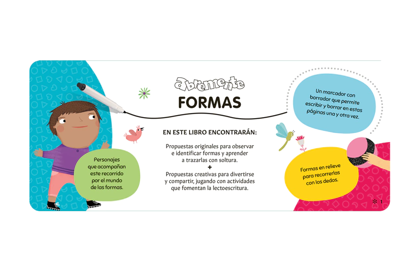 Libros con actividades, una pizarra y un marcador con borrador, para entrar en el mundo de la lectoescritura. Propuestas originales para trazar garabatos, dibujos, letras, números, grafismos, formas y aprender a practicarlos con soltura una y otra vez.