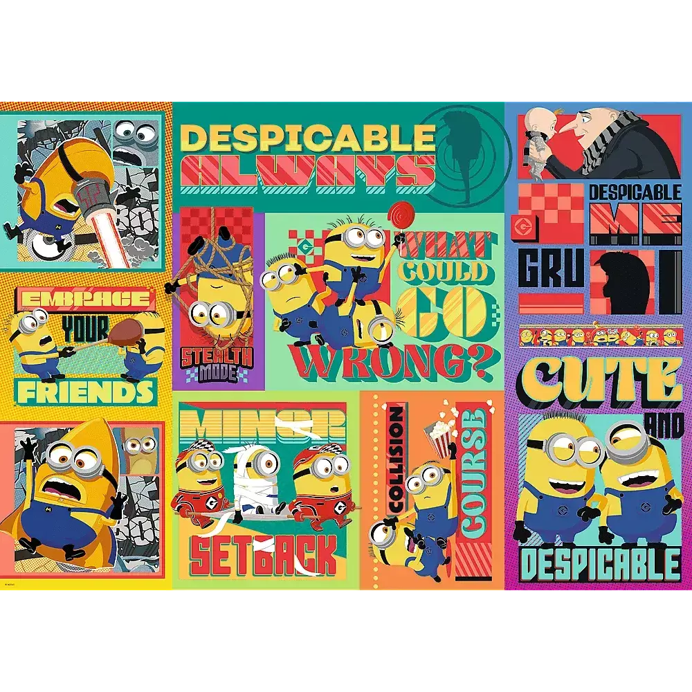 El puzzle Minions Universal , compuesto por 1000 piezas , presenta un colorido collage con los personajes de la serie de animación homónima. Una vez montado, la imagen resultante mide 683 x 480 mm.