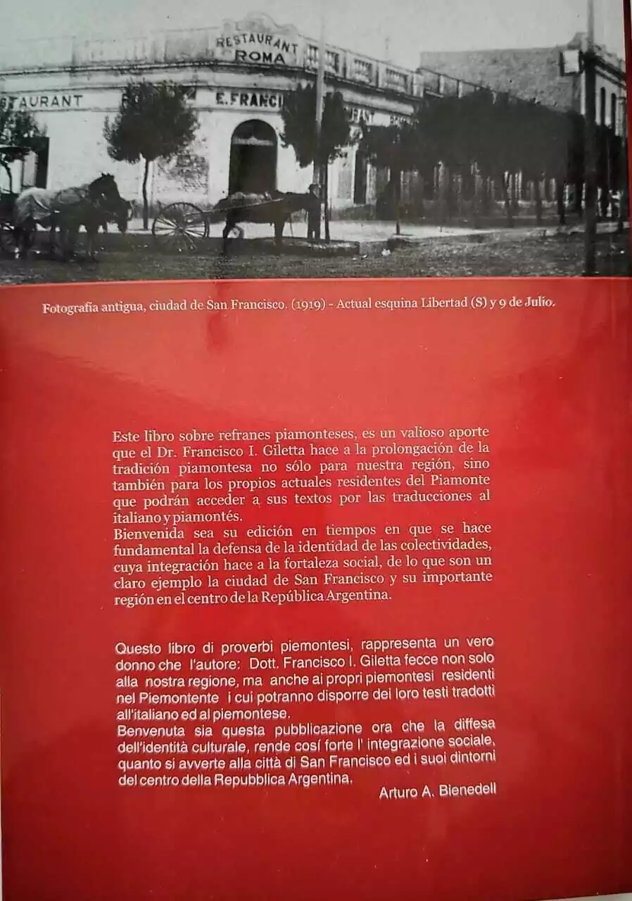 Este libro sobre refranes piamonteses, es un valioso aporte que el Dr. Francisco Giletta hace a la prolongación de la tradición piamontesa no sólo para nuestra región, sono que también para los propios actuales residentes del Piamonte que podrán acceder a sus textos por las traducciones al italiano y piamontés.